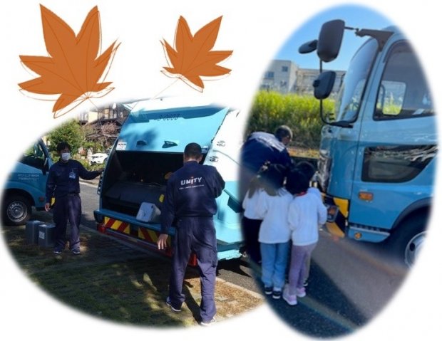 体験実習の後は、秋の陽気の中で、ごみ収集車両の見学会を行いました。ごみが破砕・圧縮されながら積み込まれる様子を、間近でご覧いただきました。