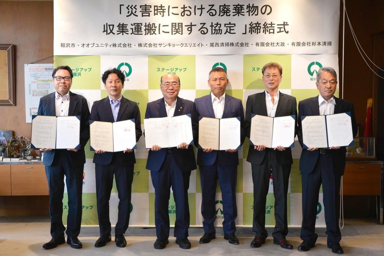 2025年10月03日(金) 稲沢市との「災害時における廃棄物収集運搬に関する協定」締結 稲沢市と「災害時における廃棄物の収集運搬に関する協定」を締結致しました。 災害時に大量に発生する災害ごみの収集、運搬、処理をスムーズに進める為、稲沢市内の清掃事業者等6社と共に協定を締結。市災害廃棄物処理計画では、南海トラフ地震が発生した場合、市内で年間の一般ごみの約10倍に相当する39万トンの災害ごみが出ると推計されました。市だけでは数年かけても処理できず、市や各社と力を合わせて、迅速に市民生活を復旧する一助になれば幸いです。 2025.9.29 稲沢市との災害協定式の様子 (左から1番目:オオブユニティ(株)岩瀬、左から3番目:稲沢市長 加藤 錠司郎 様)